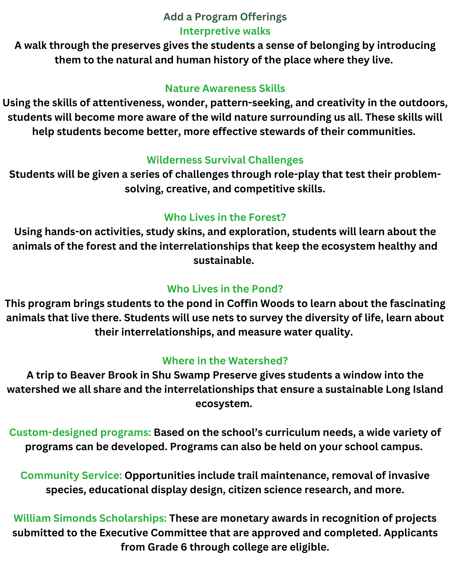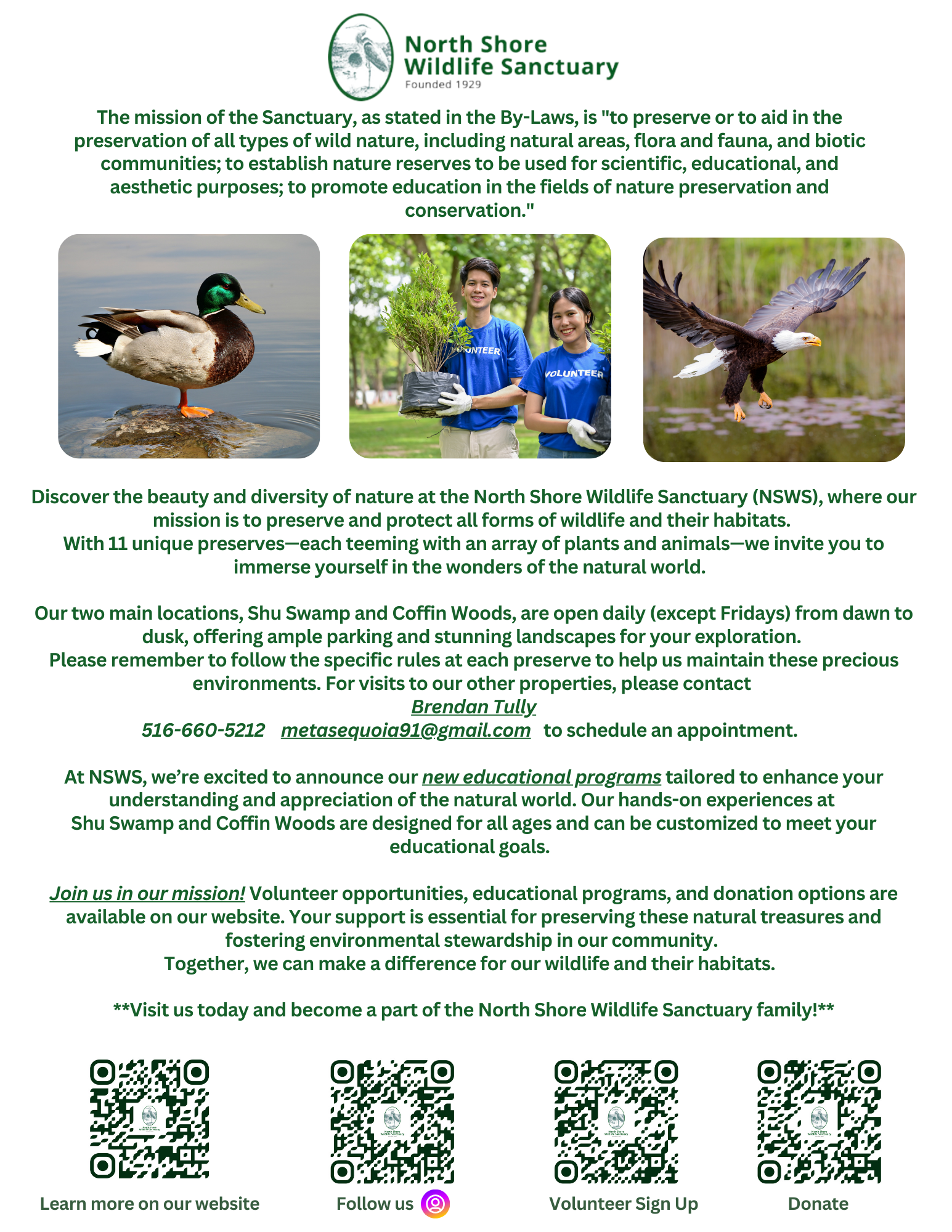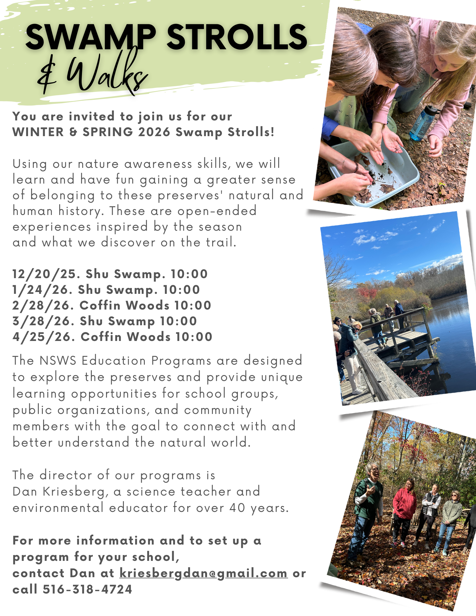 Come visit the NSWS table at the Cold Spring Harbor Library Environmental Fair (2-4pm). There will be information regarding NSWS and its history, the status of the preserves, opportunities to participate in Volunteer Day projects, and future events such as lectures and guided walks. There will be many other conservation and environmental groups attending this fair (https://coldspringharbor.librarycalendar.com/event/environmental-fair)