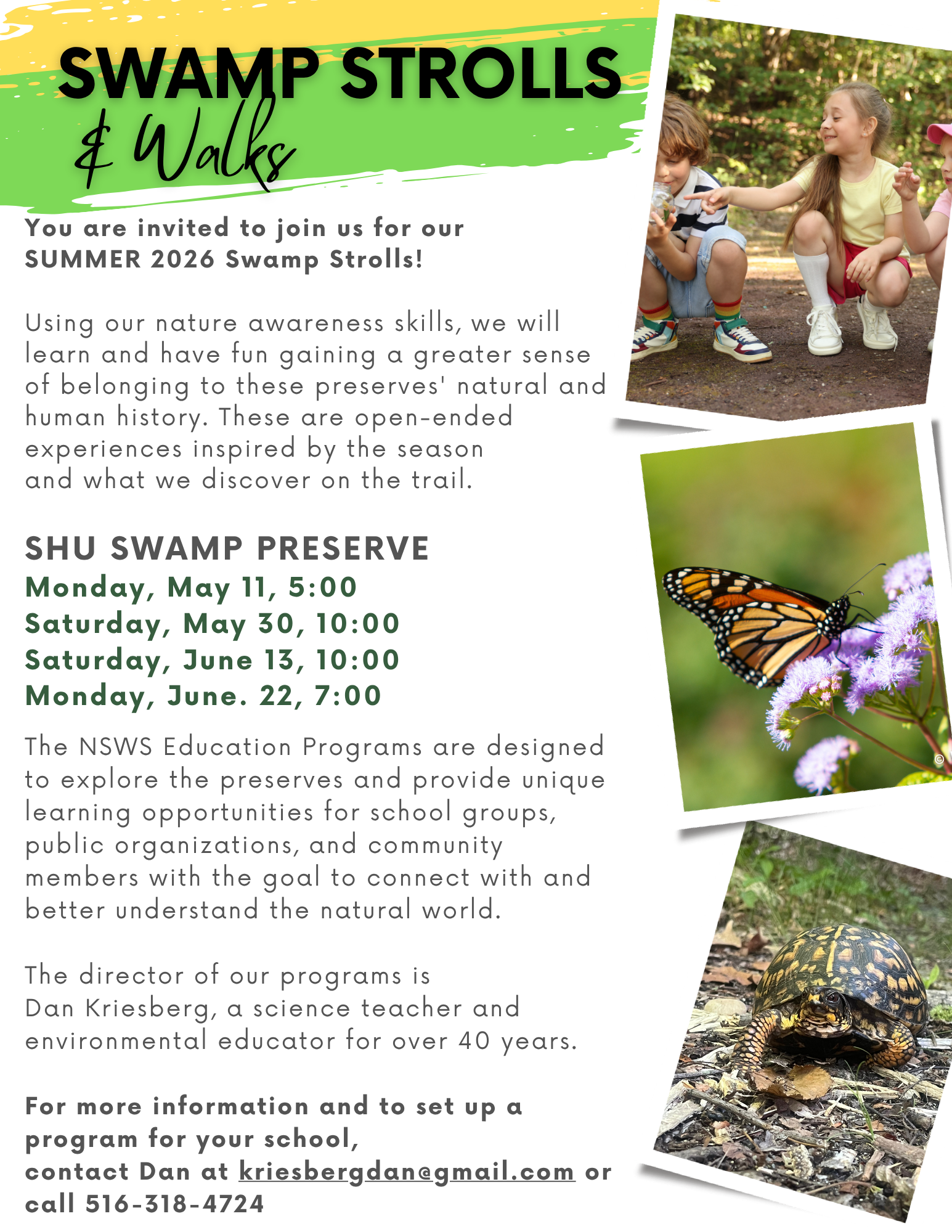 Come visit the NSWS table at the Cold Spring Harbor Library Environmental Fair (2-4pm). There will be information regarding NSWS and its history, the status of the preserves, opportunities to participate in Volunteer Day projects, and future events such as lectures and guided walks. There will be many other conservation and environmental groups attending this fair (https://coldspringharbor.librarycalendar.com/event/environmental-fair)